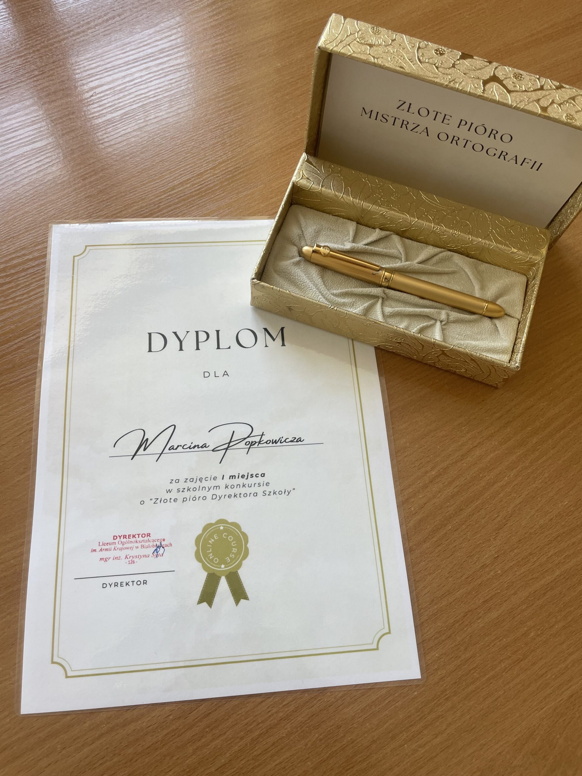 29 kwietnia 2024 roku w naszej szkole odbyło się II Dyktando o „Złote Pióro” Dyrektora Szkoły. Do dyktanda przystąpiło 61 uczniów klas I, II i III. Uczestnicy musieli zmierzyć się z takimi zagadkami ortograficznymi jak: eksnarzeczona, Brzyskorzystewku, pięcioipółletni, jaskraworóżowy, esy-floresy, Żywiecczyzna, pseudoznawca. Jury wyłoniło Mistrza Ortografii, którym został uczeń klasy 2b1 – Marcin Popkowicz. Na wyróżnienie zasłużyły również prace dwóch uczennic – Izabeli Dąbrowskiej (3c) i Aleksandry Jelonek (2d).