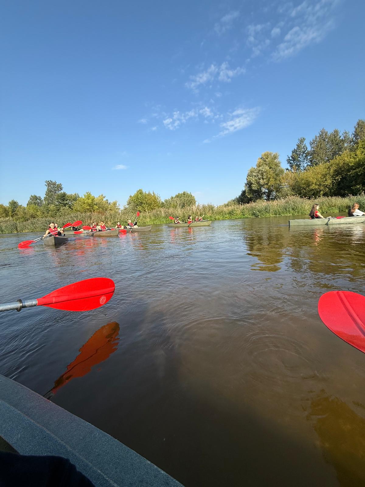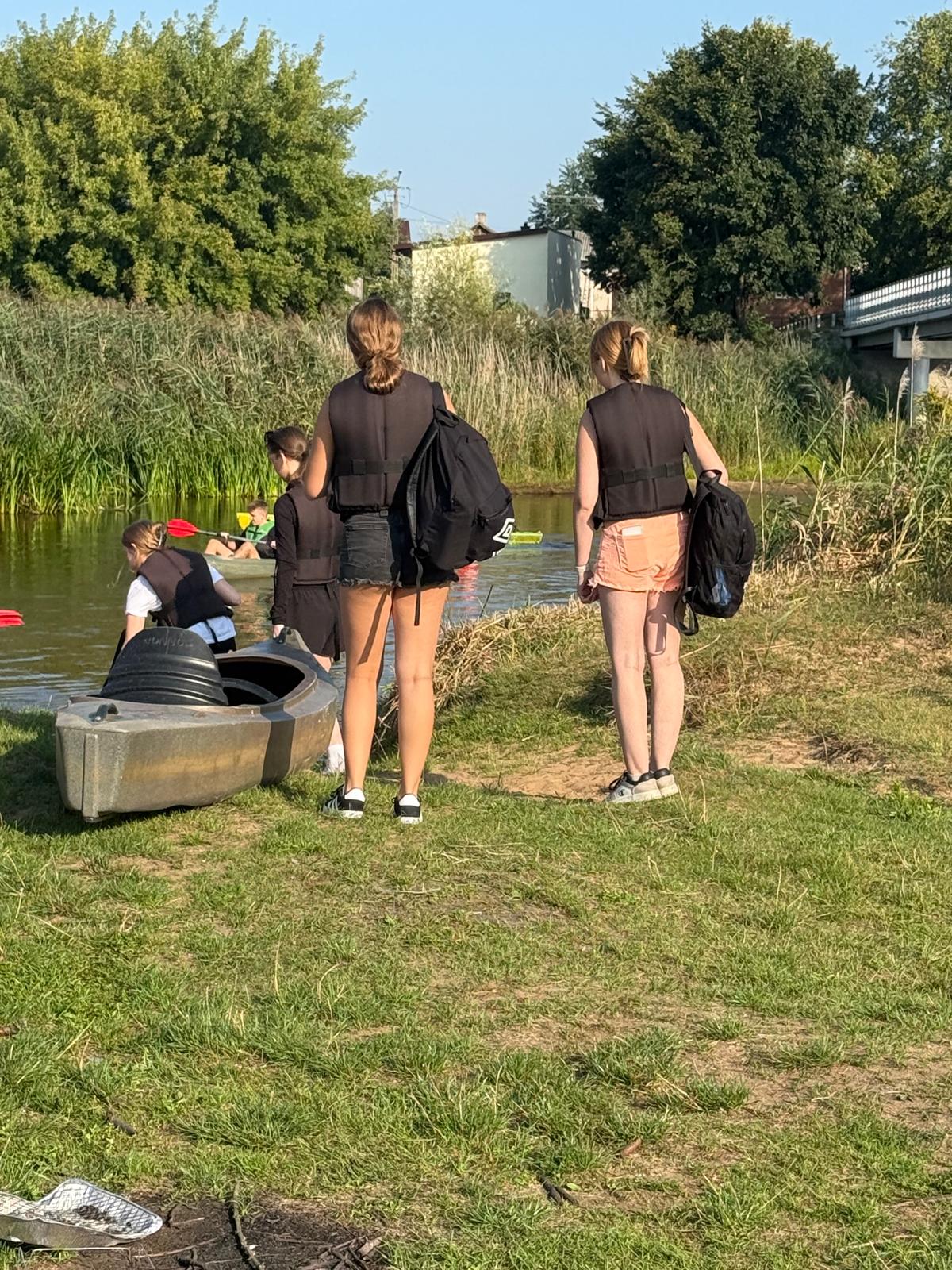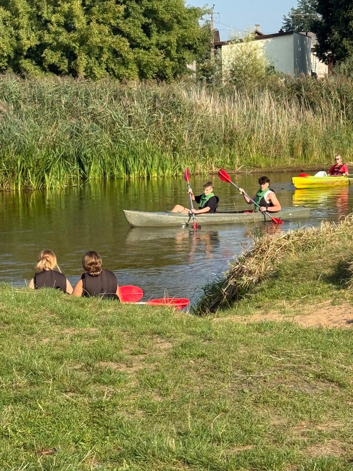 Trasa spływu obfitowała w malownicze widoki – zielone brzegi, szumiące drzewa i słońce przebijające się przez liście. Woda była spokojna, jednak wymagała od uczniów współpracy, nie obyło się również bez kilku małych „przygód”, które tylko dodały uroku całej wyprawie.