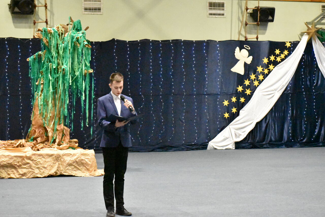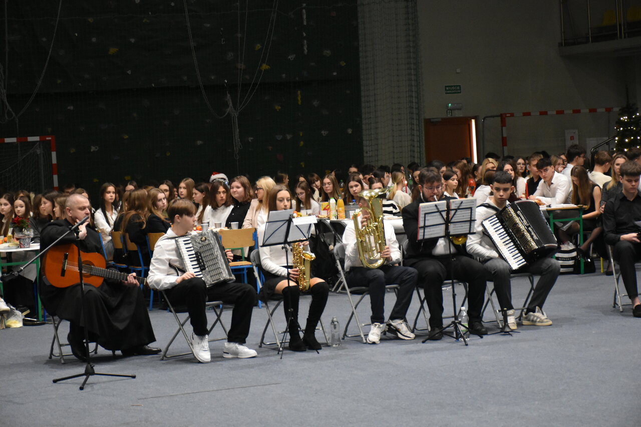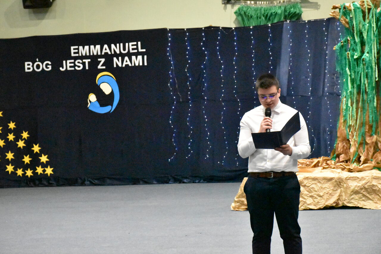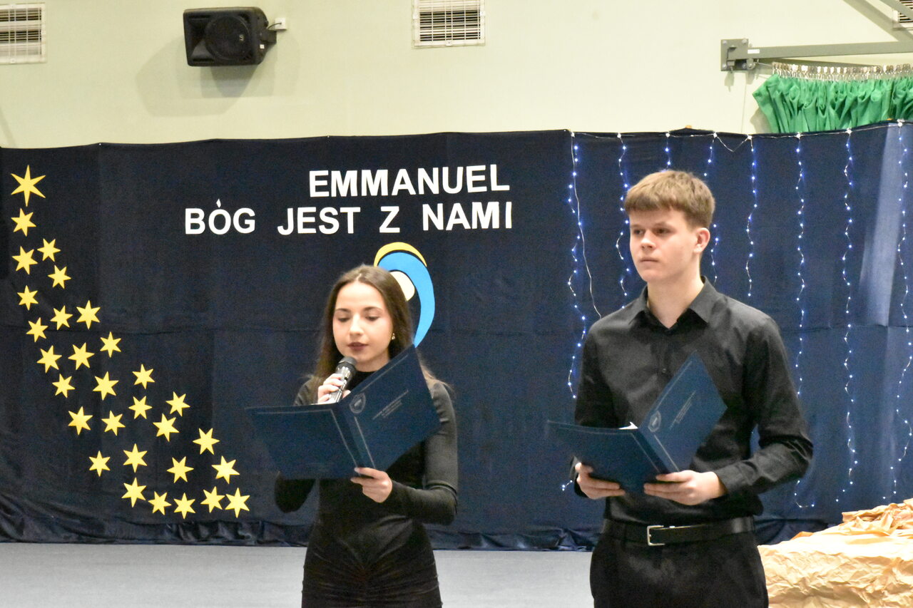 19 grudnia 2024 roku w naszej szkole miała miejsce niezwykła uroczystość – szkolna Wigilia. Hala Sportowa zamieniła się w prawdziwe świąteczne miejsce, pełne ciepła, radości i bożonarodzeniowej atmosfery. Jasełka zostały przygotowane przez naszych uczniów pod czujnym okiem księdza Grzegorza Potrzebowskiego oraz pani Eweliny Matysiak. W tym roku przedstawienie miało oryginalną wersję słowno-muzyczną. Całość przedstawienia wprowadziła nas w refleksyjny, ale i radosny nastrój Świąt Bożego Narodzenia.