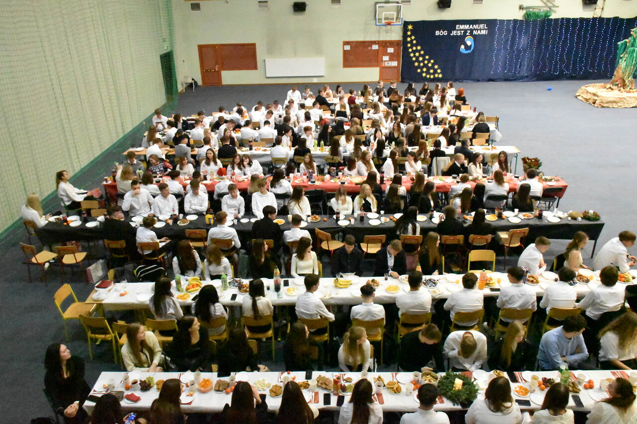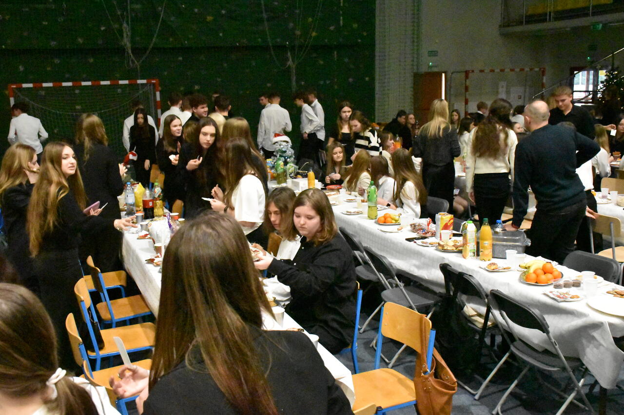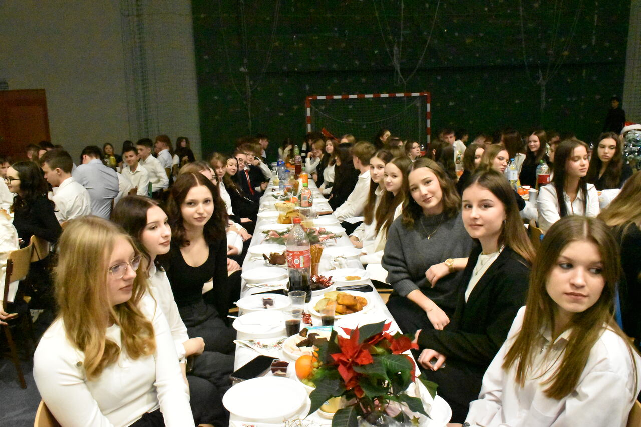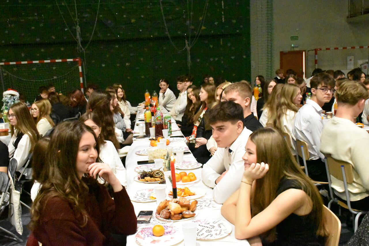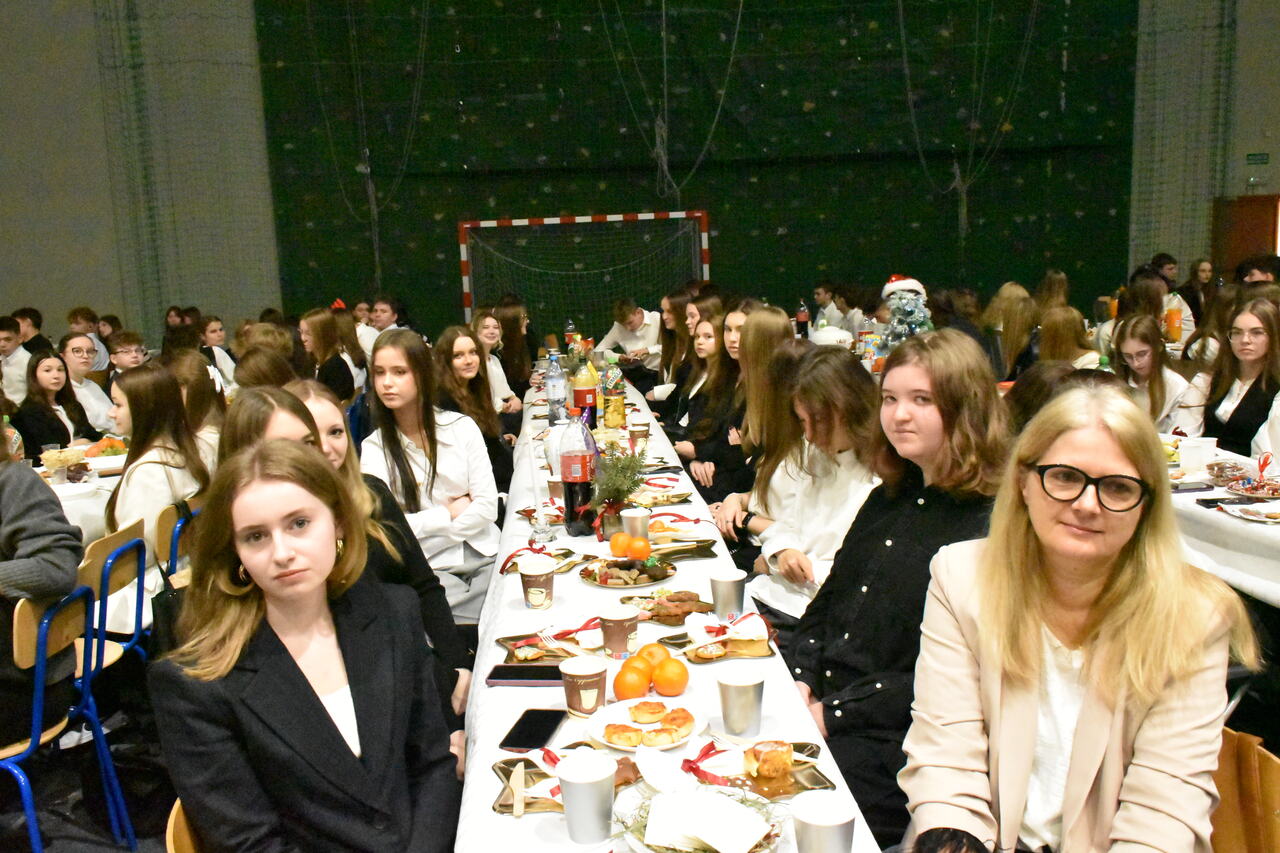Po części artystycznej przyszedł czas na tradycyjne dzielenie się opłatkiem. Był to moment pełen wzruszeń, życzeń i wspólnego przeżywania świątecznej radości. Po modlitwie i łamaniu opłatka zasiedliśmy do stołów, które były pięknie udekorowane. Przy dźwiękach kolęd skosztowaliśmy tradycyjnych wigilijnych potraw, które wprowadziły nas w prawdziwy, bożonarodzeniowy klimat.