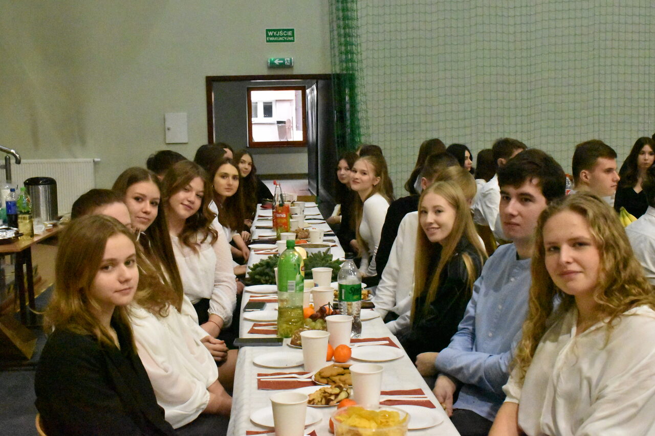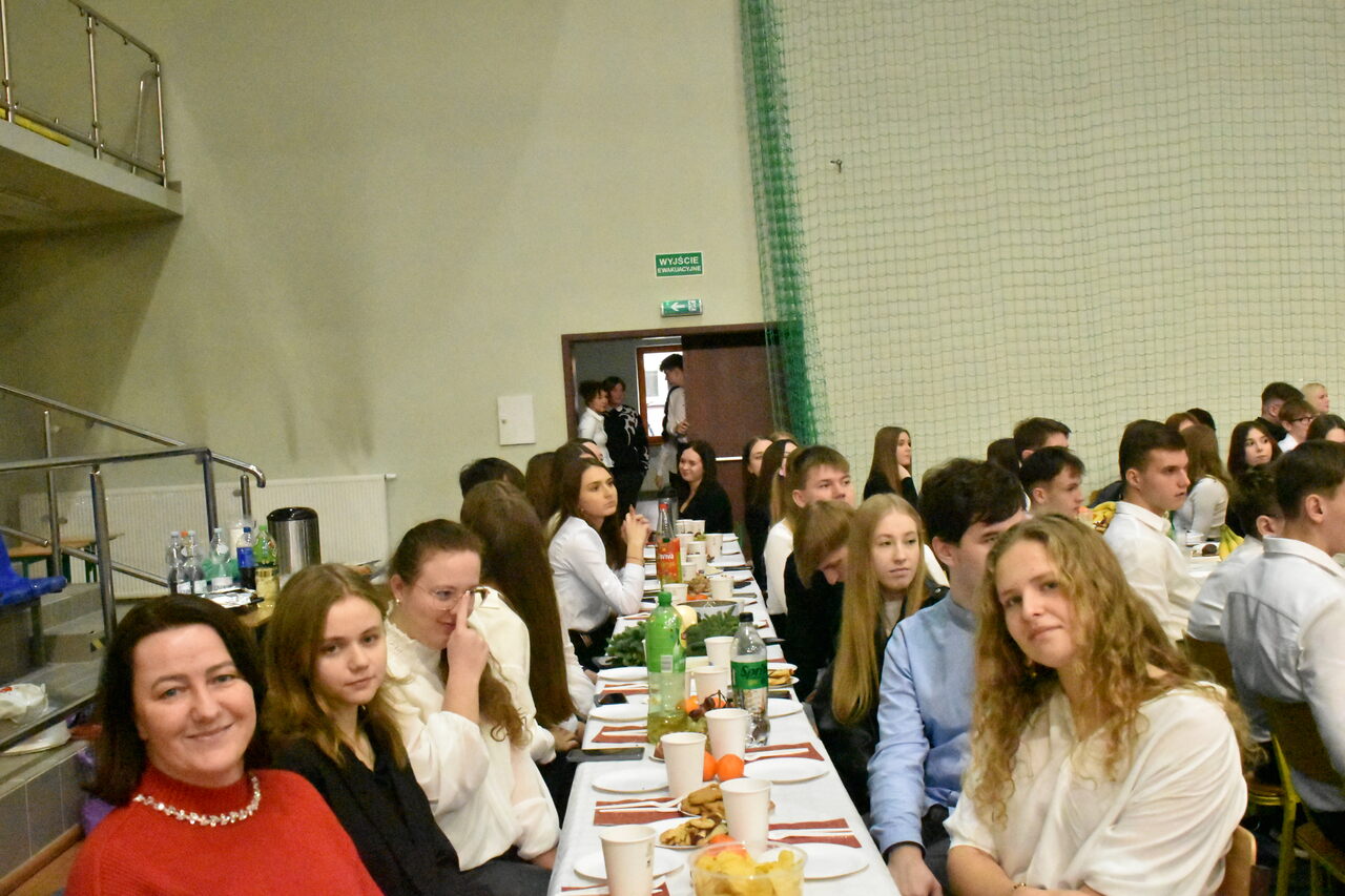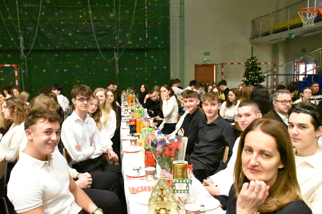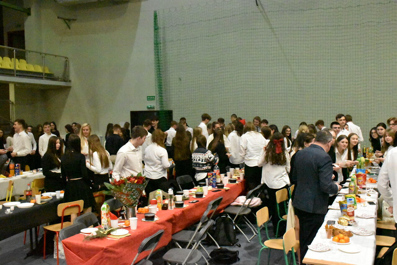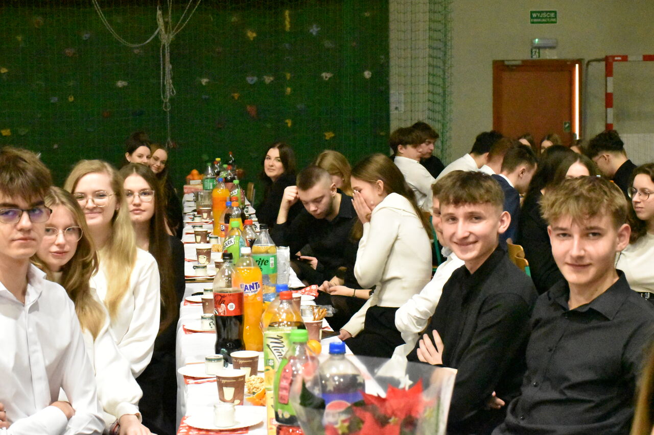 Po części artystycznej przyszedł czas na tradycyjne dzielenie się opłatkiem. Był to moment pełen wzruszeń, życzeń i wspólnego przeżywania świątecznej radości. Po modlitwie i łamaniu opłatka zasiedliśmy do stołów, które były pięknie udekorowane. Przy dźwiękach kolęd skosztowaliśmy tradycyjnych wigilijnych potraw, które wprowadziły nas w prawdziwy, bożonarodzeniowy klimat.