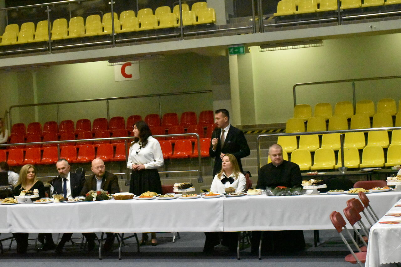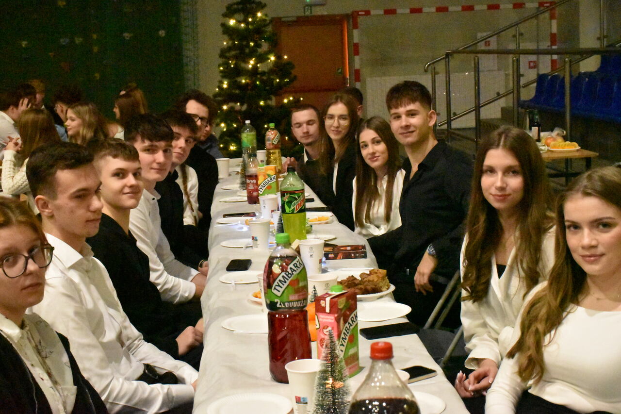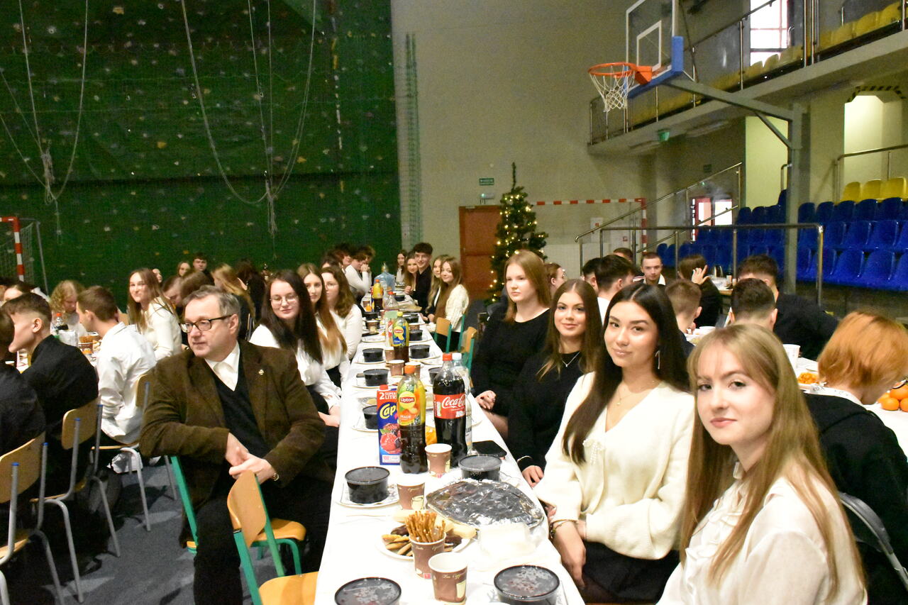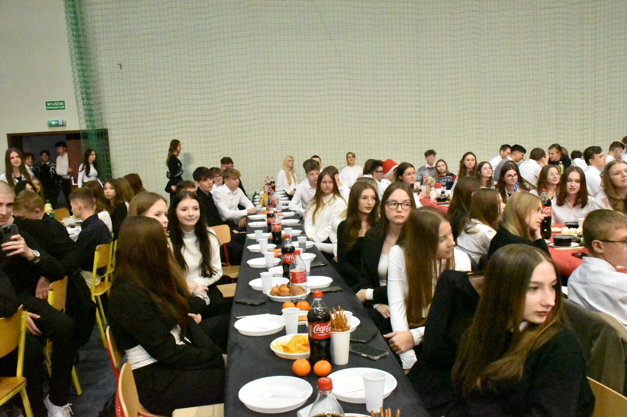 Po części artystycznej przyszedł czas na tradycyjne dzielenie się opłatkiem. Był to moment pełen wzruszeń, życzeń i wspólnego przeżywania świątecznej radości. Po modlitwie i łamaniu opłatka zasiedliśmy do stołów, które były pięknie udekorowane. Przy dźwiękach kolęd skosztowaliśmy tradycyjnych wigilijnych potraw, które wprowadziły nas w prawdziwy, bożonarodzeniowy klimat.