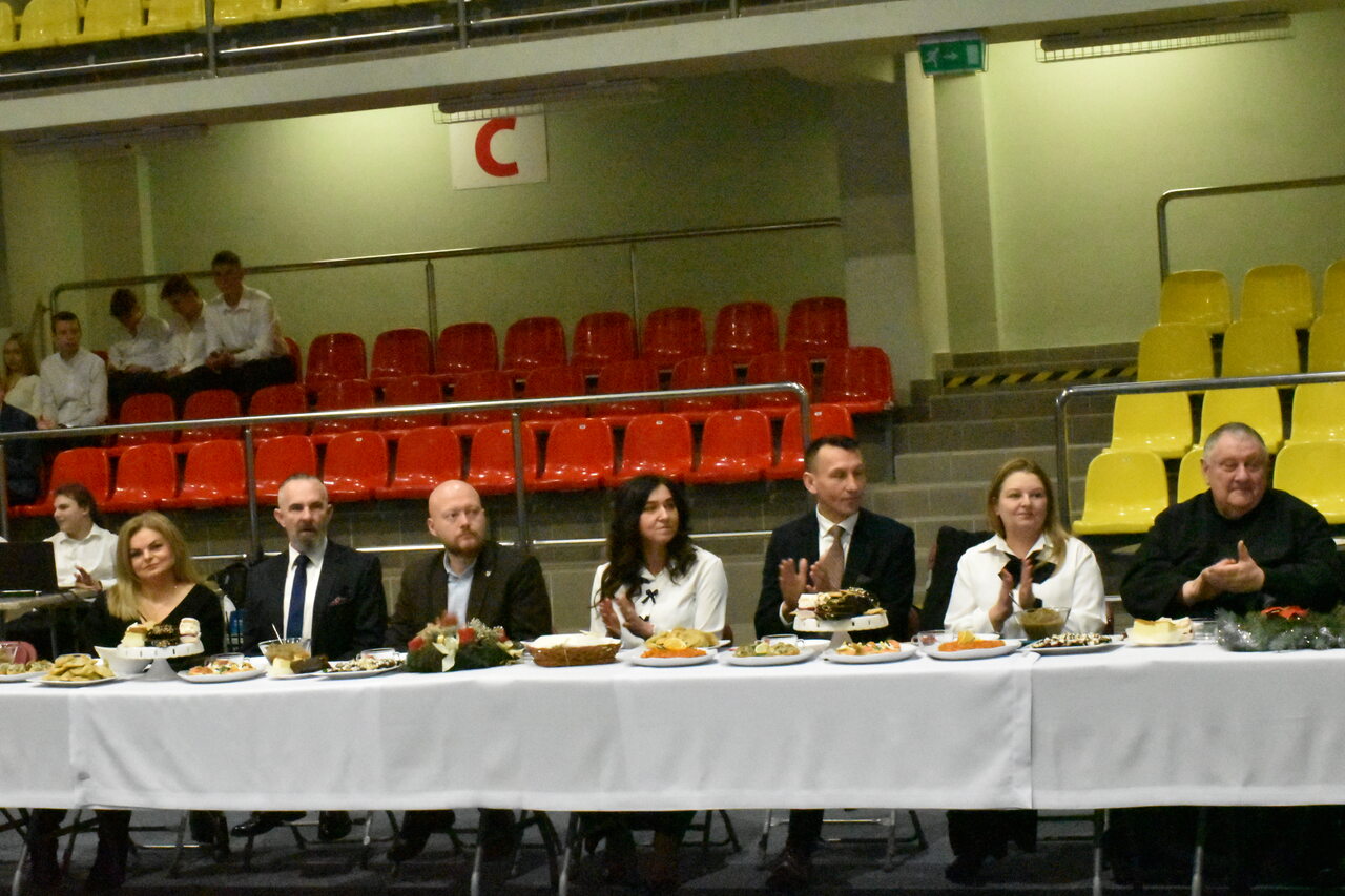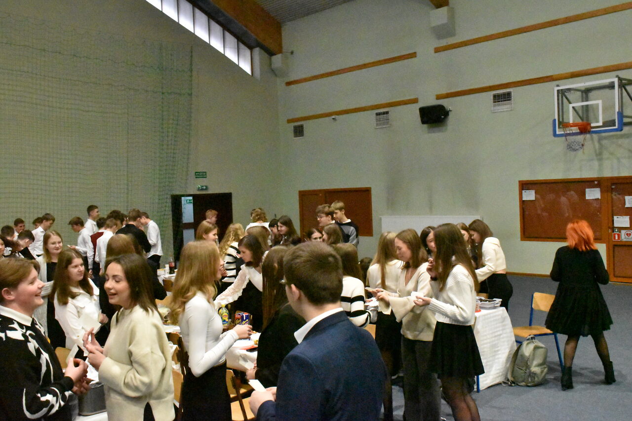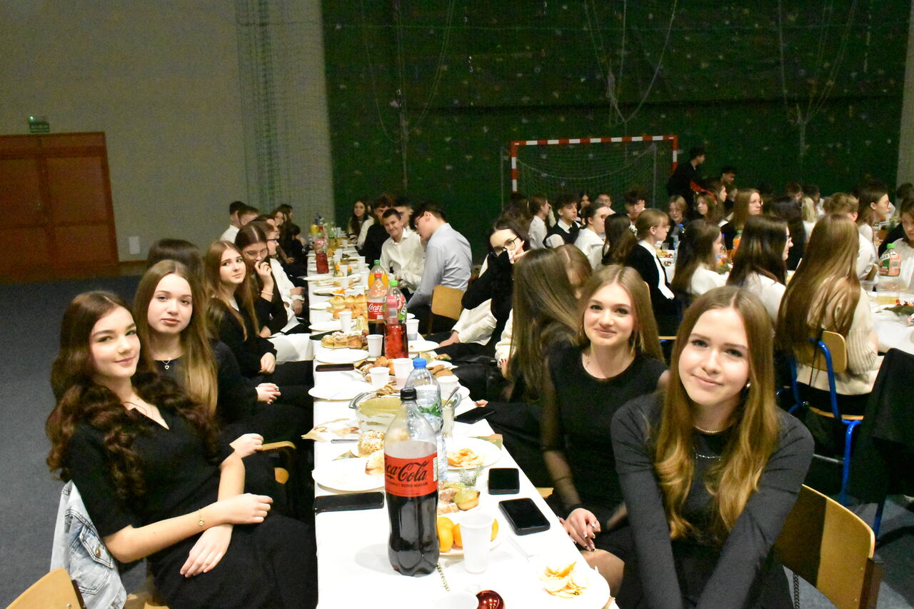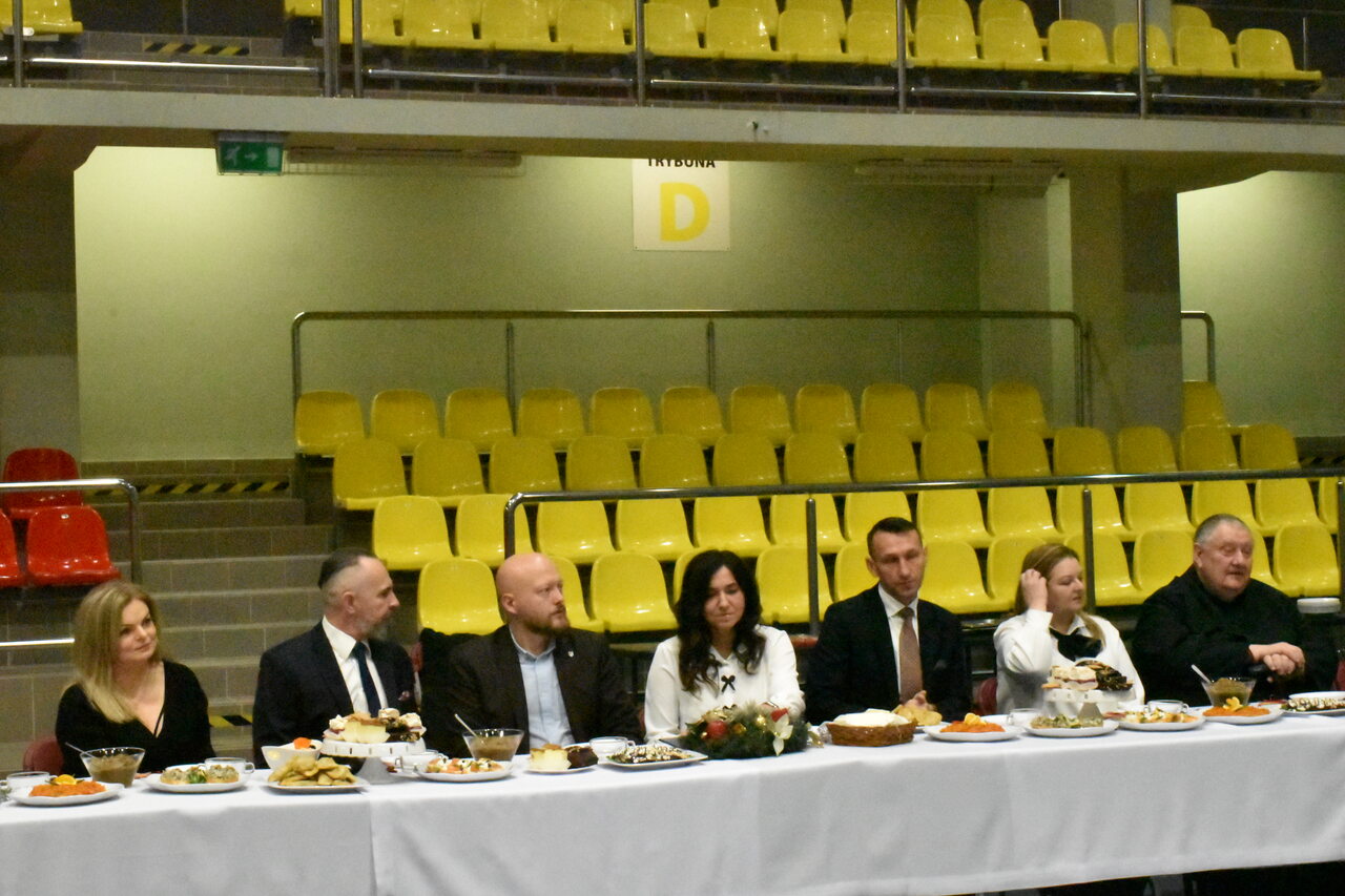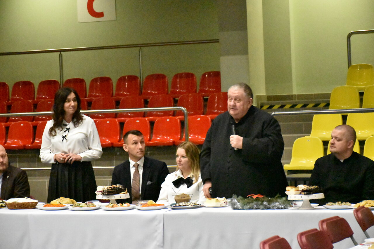 Po części artystycznej przyszedł czas na tradycyjne dzielenie się opłatkiem. Był to moment pełen wzruszeń, życzeń i wspólnego przeżywania świątecznej radości. Po modlitwie i łamaniu opłatka zasiedliśmy do stołów, które były pięknie udekorowane. Przy dźwiękach kolęd skosztowaliśmy tradycyjnych wigilijnych potraw, które wprowadziły nas w prawdziwy, bożonarodzeniowy klimat.