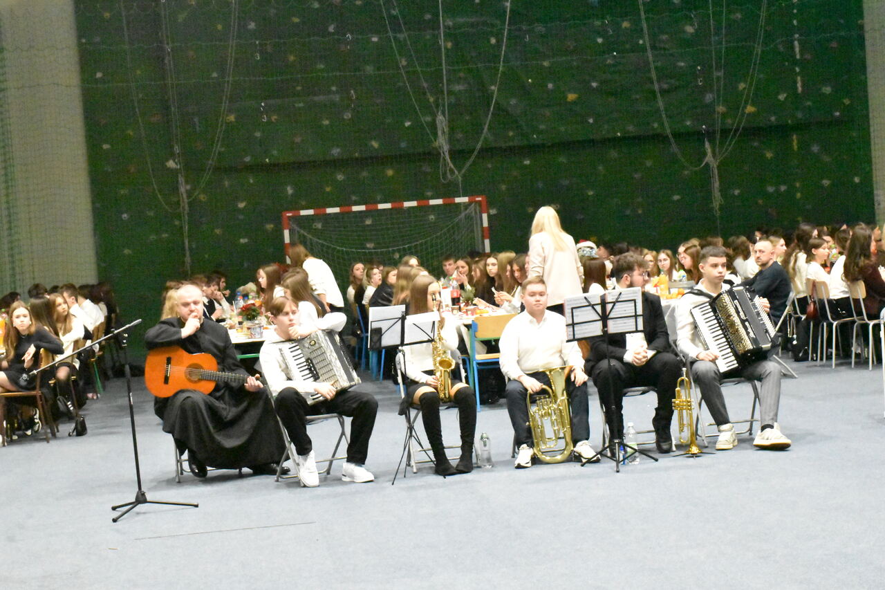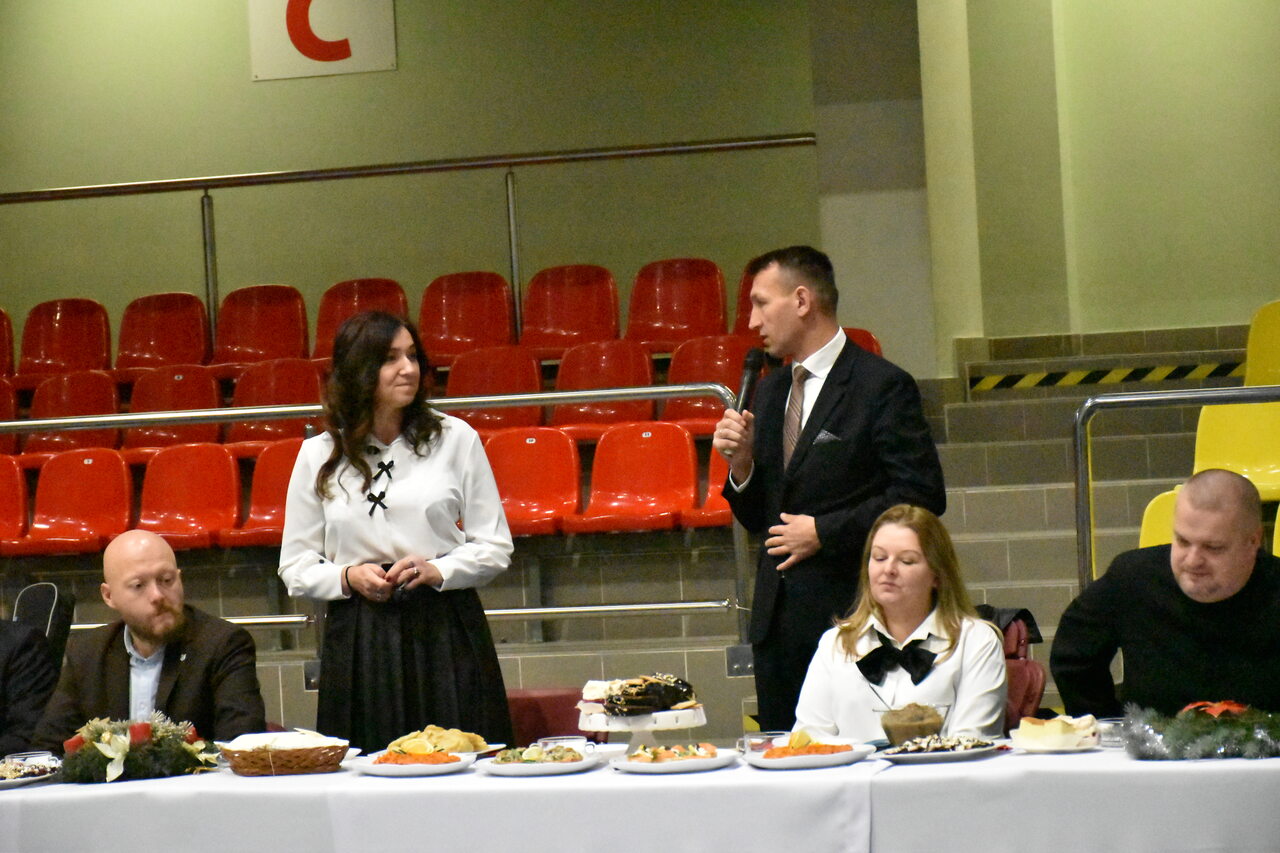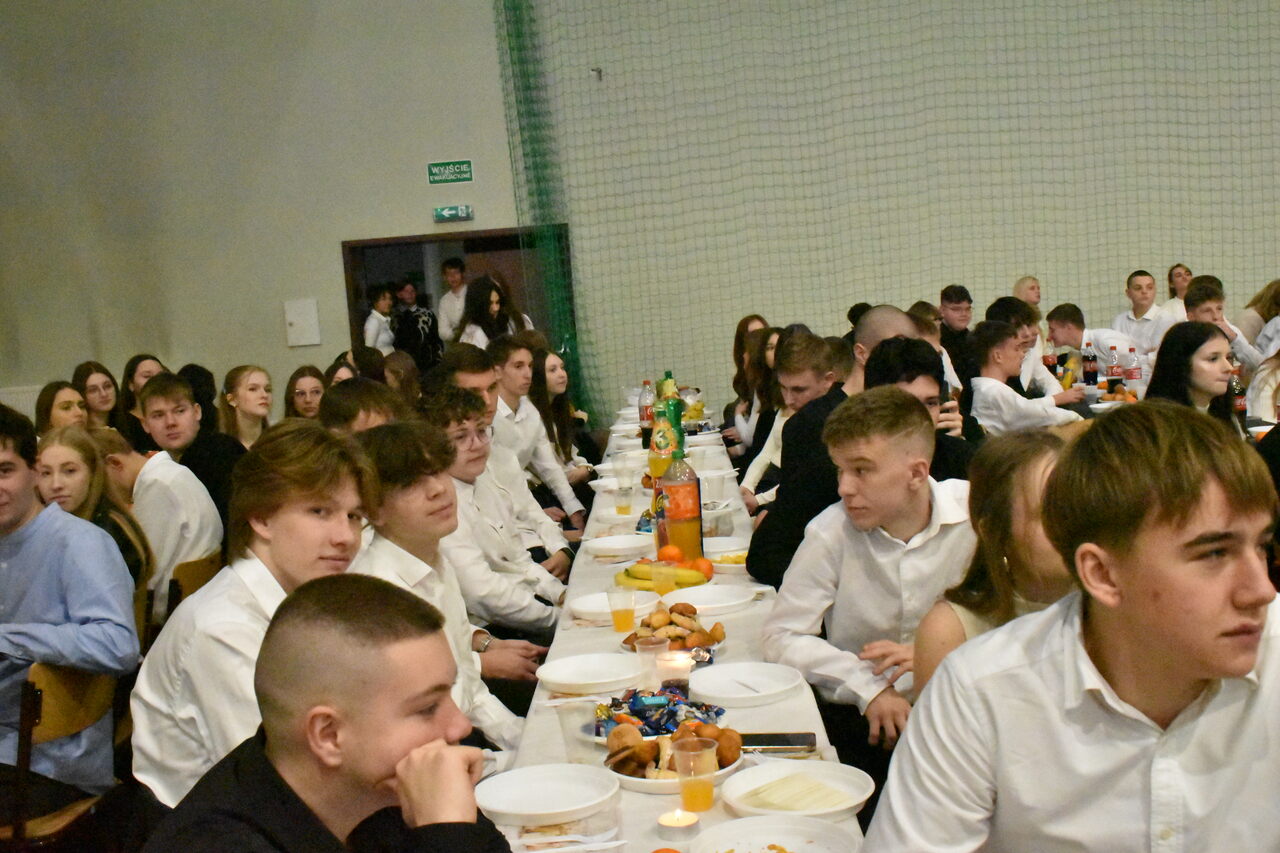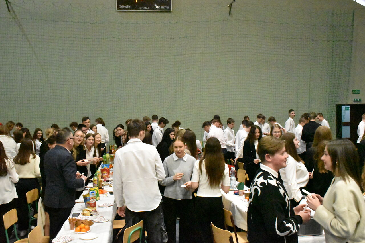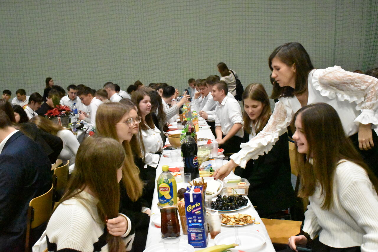 Po części artystycznej przyszedł czas na tradycyjne dzielenie się opłatkiem. Był to moment pełen wzruszeń, życzeń i wspólnego przeżywania świątecznej radości. Po modlitwie i łamaniu opłatka zasiedliśmy do stołów, które były pięknie udekorowane. Przy dźwiękach kolęd skosztowaliśmy tradycyjnych wigilijnych potraw, które wprowadziły nas w prawdziwy, bożonarodzeniowy klimat.