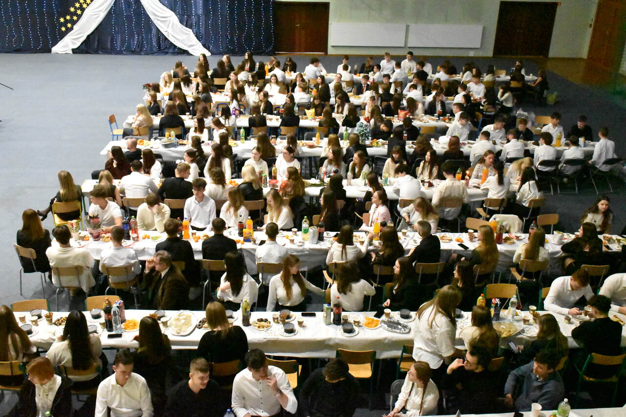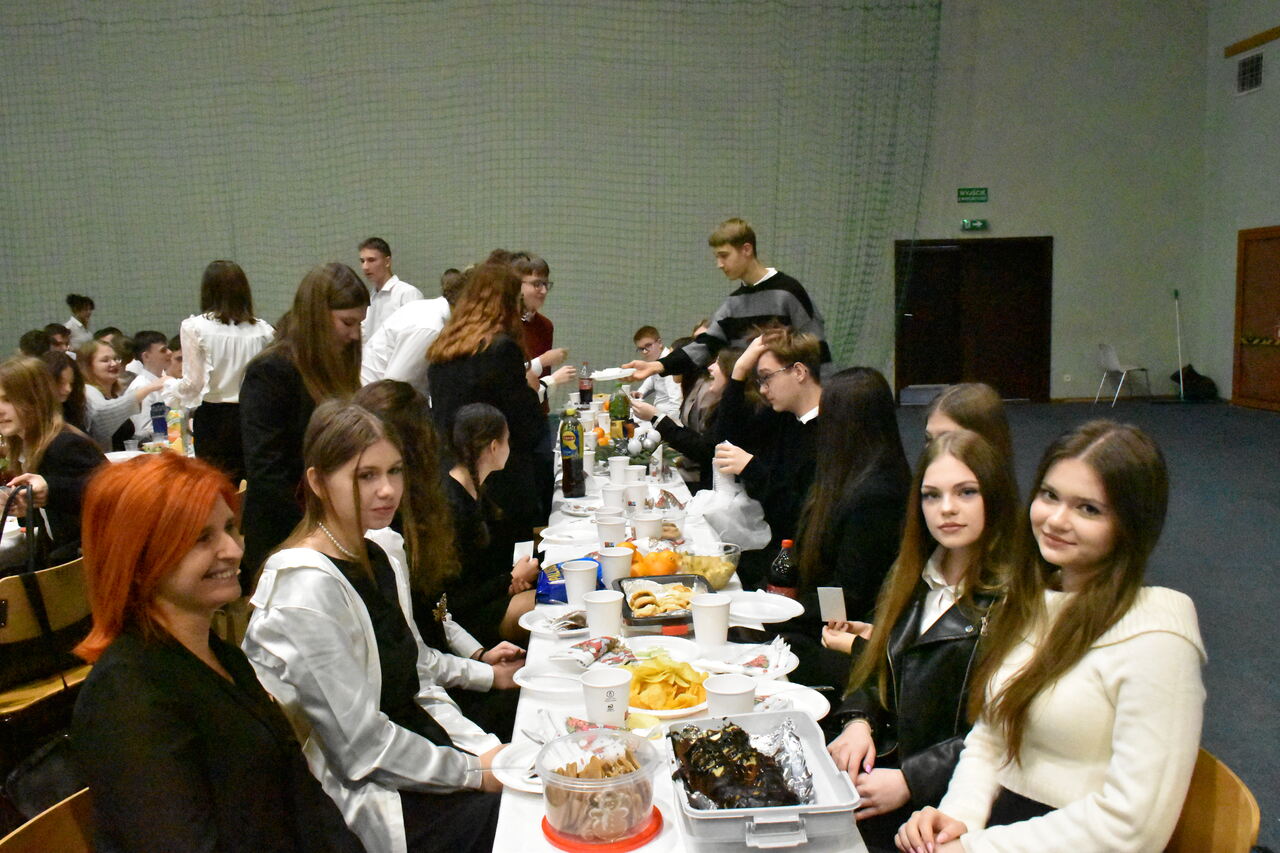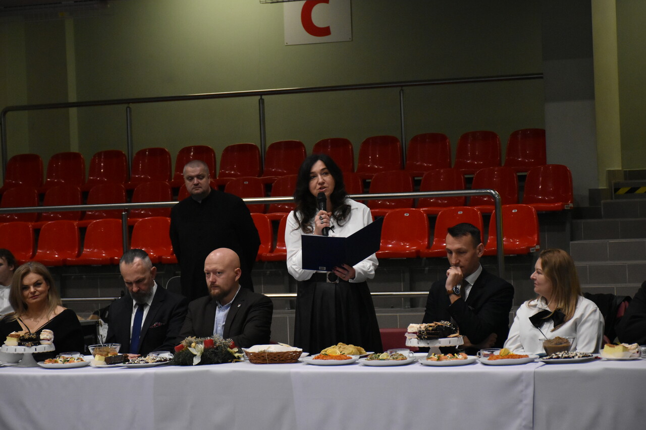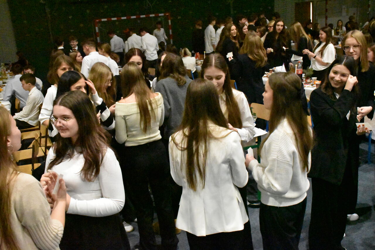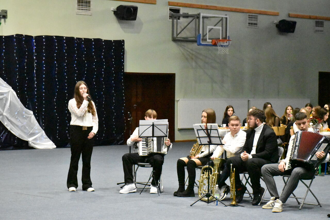 Po części artystycznej przyszedł czas na tradycyjne dzielenie się opłatkiem. Był to moment pełen wzruszeń, życzeń i wspólnego przeżywania świątecznej radości. Po modlitwie i łamaniu opłatka zasiedliśmy do stołów, które były pięknie udekorowane. Przy dźwiękach kolęd skosztowaliśmy tradycyjnych wigilijnych potraw, które wprowadziły nas w prawdziwy, bożonarodzeniowy klimat.